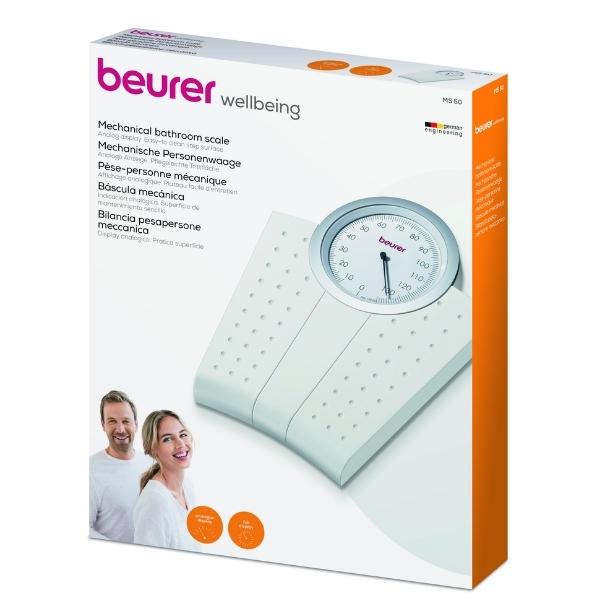 Cân sức khỏe cơ học Beurer MS50 có màu sắc trắng tinh tế với màn hình hiển thị trọng lượng chính xác, thiết kế cổ điển, tải trọng lên đến 135 kg, chống nước nên dùng được nhà tắm.