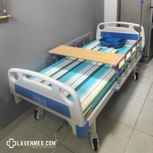 Bàn đi kèm với giường bệnh: Giường bệnh 1 tay quay A01-I có bàn đi kèm thuận tiện cho bệnh nhân trong việc ăn uống mà không cần phải rời khỏi giường bệnh.