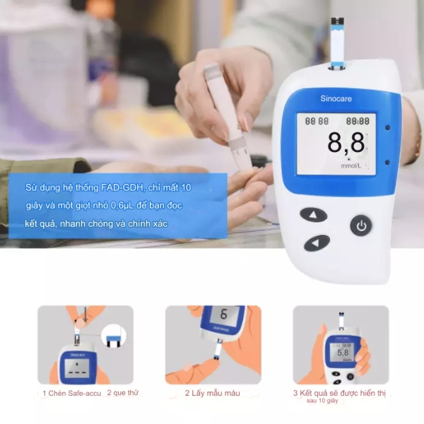 - Sản phẩm có thể sử dụng chung với que thử Sinocare Safe Accu để cho kết quả nhanh, độ chính xác cao, tin cậy như khi tiến hành đo ở bệnh viện, phòng khám.