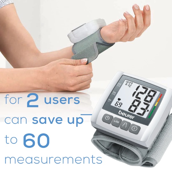Máy đo huyết áp điện tử cổ tay Beurer BC30 của Đức dễ sử dụng tại nhà cảnh báo huyết áp bằng vạch màu theo tiêu chuẩn WHO, cảnh báo rối loạn nhịp tim, bộ nhớ 2x60, cho kết quả nhanh, chính xác.